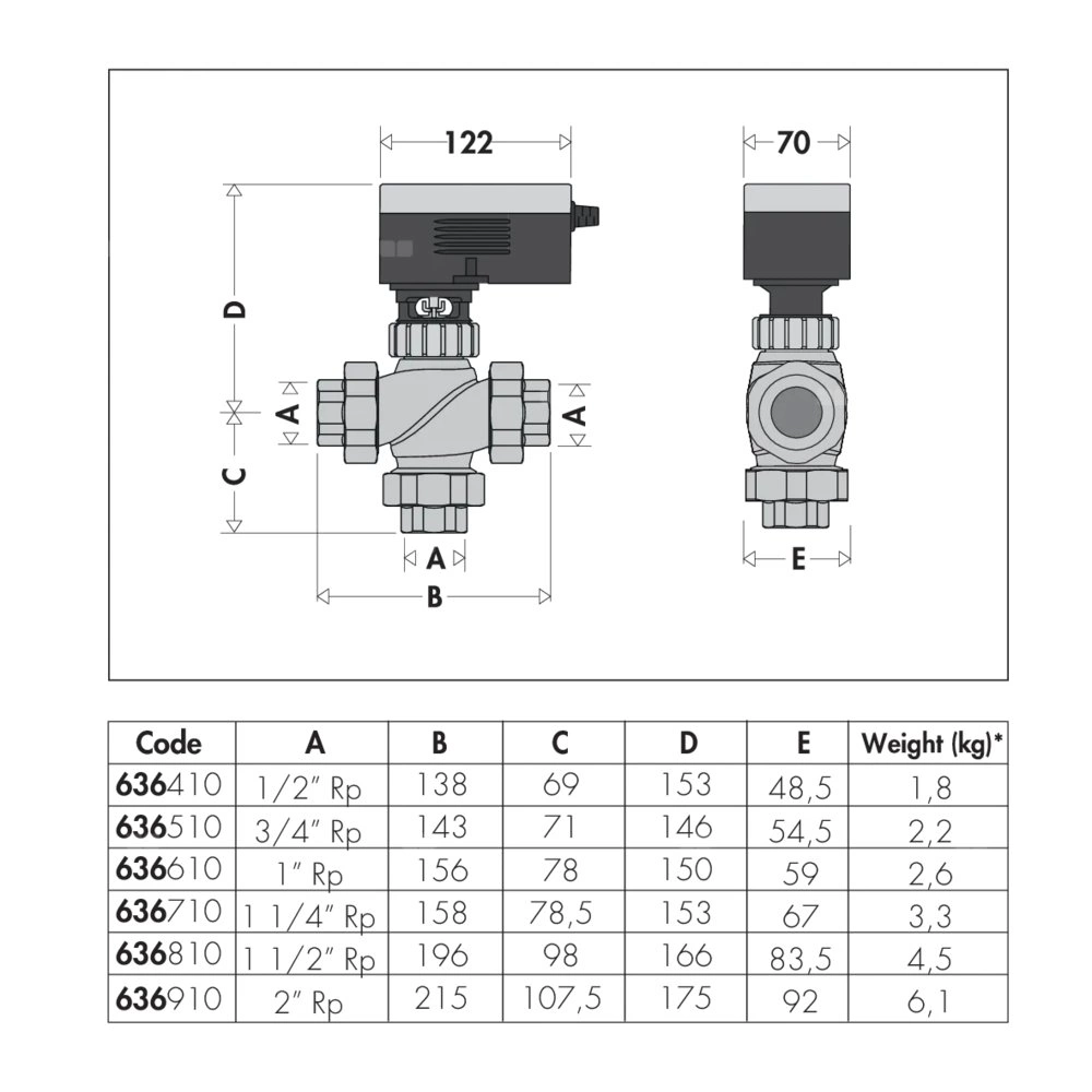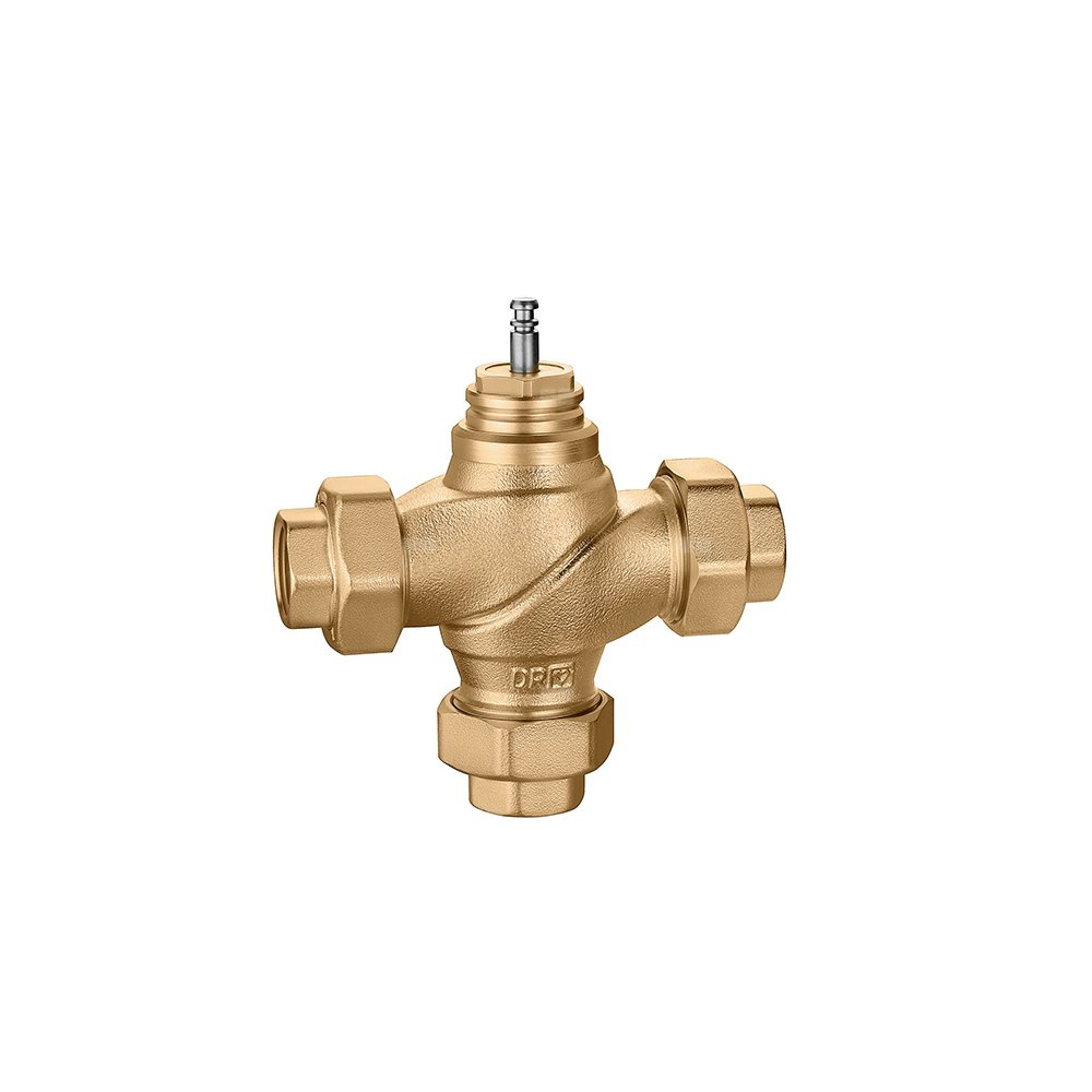 Trójdrożny zawór regulacyjny, gwintowany Charakterystyka stałoprocentowa. Przyłącze: Rp 2" (EN 10226-1) GW, złączka. Maksymalne ciśnienie pracy: 16 bar. Zakres temperatury medium: 0–100 °C. PN (Ciśnienie nominalne): PN 16. DN: DN 50 (korpus). Kv: 28 m³/h.
