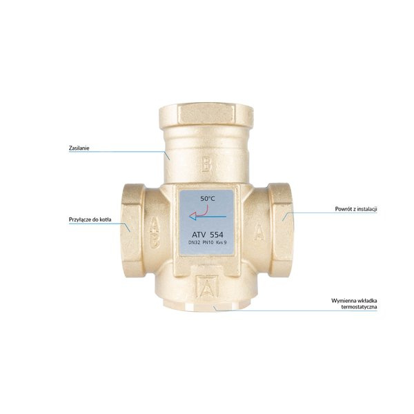 Zawór temp.powrotu kotła ATV 554, DN32, Rp1 1/4", 50°C, Kvs 12 m3/h-AFRISO