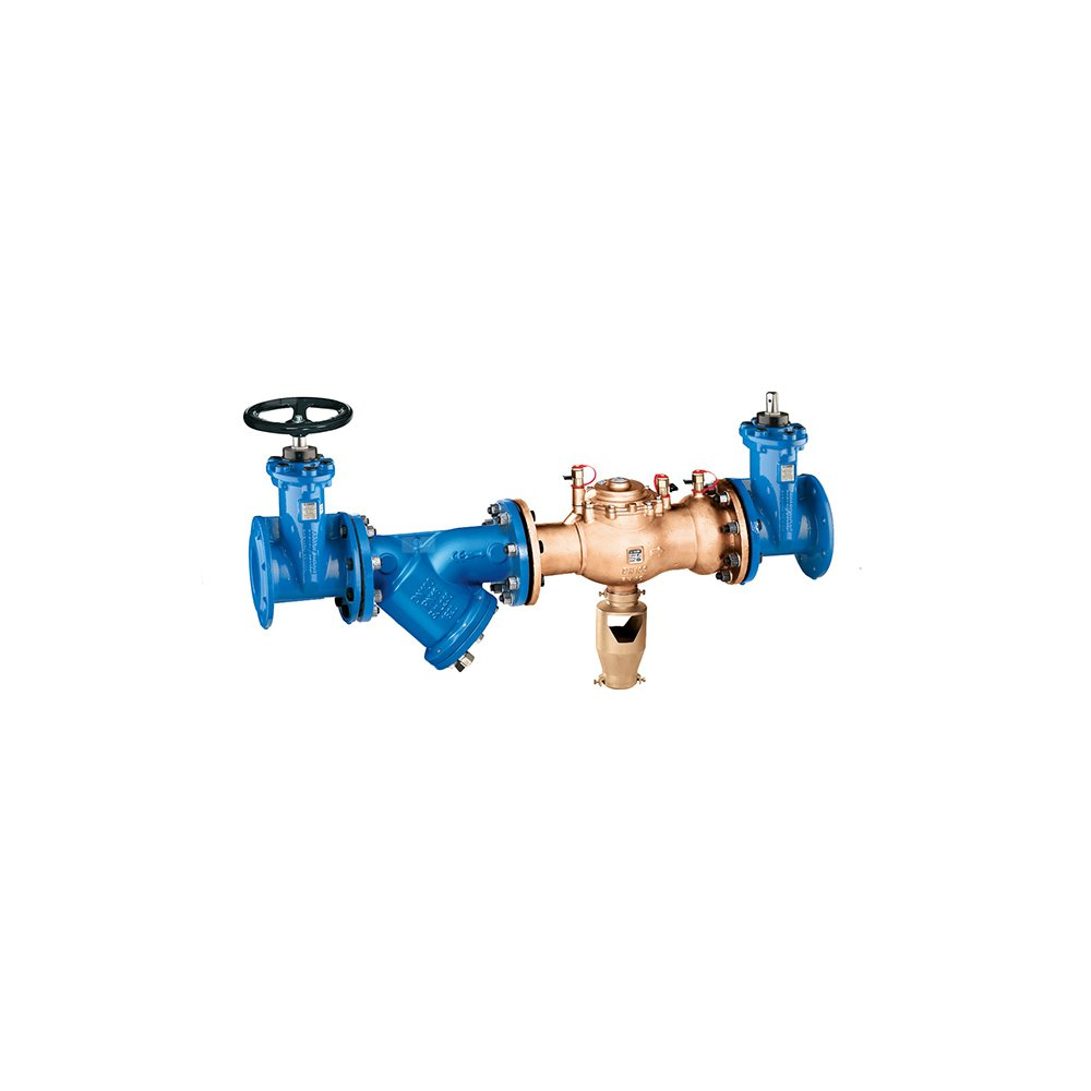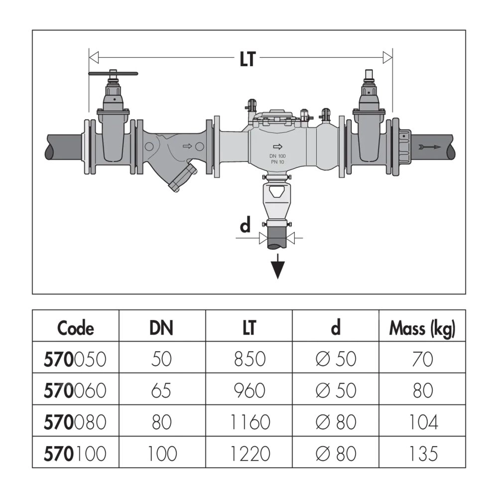 Zespół ochrony instalacji wodociągowej, przyłącza kołnierzowe PN 16. Współpraca z przeciwkołnierzem EN 1092-1. Zawiera: -izolator przepływów zwrotnych serii 575; -filtr skośny serii 579; -ręczne zawory odcinające. Przyłącze: DN 100 (EN 1092-1) PN 16. Zakres temperatury medium: 0–65 °C. PN (Ciśnienie nominalne): PN 10.