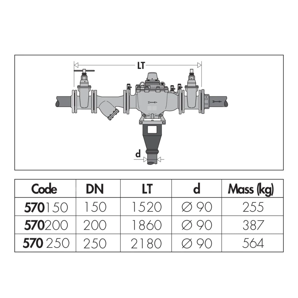 Wstępnie zmontowana grupa, przyłącza kołnierzowe PN 16. Współpraca z przeciwkołnierzem EN 1092-1. Zawiera: -izolator przepływów zwrotnych serii 575; -filtr skośny serii 579; -ręczne zawory odcinające. Przyłącze: DN 250 (EN 1092-1) PN 16. Zakres temperatury medium: 0–60 °C. PN (Ciśnienie nominalne): PN 10. DN: DN 250 (korpus).