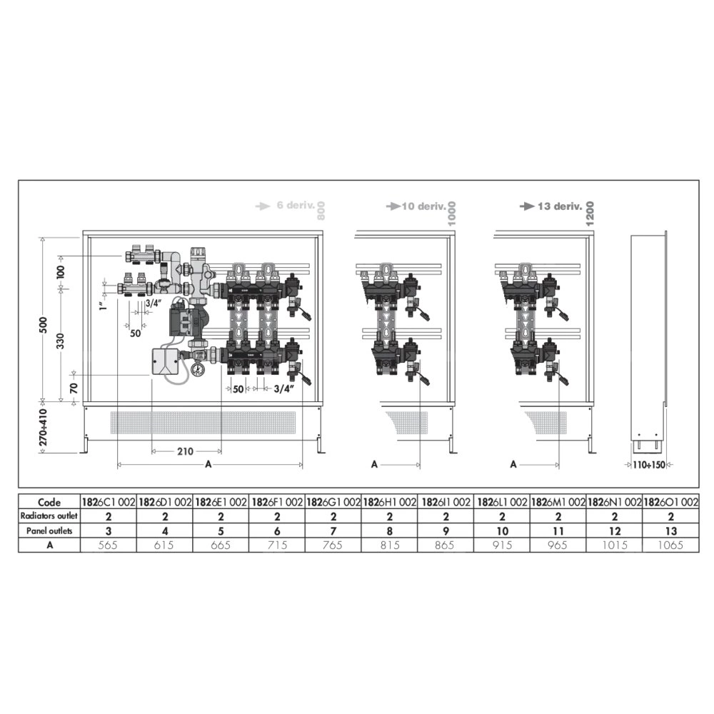 Zespół regulacyjny - regulacja stałotemperaturowa. Wstępnie zmontowany w skrzynce inspekcyjnej. Dodatkowy rozdzielacz obiegu pierwotnego. W komplecie: - termostatyczny ukłąd regulacji; - para rozdzielaczy z zaworami regulacyjnymi i zaworami odcinającymi obiegu pierwotnego; - para rozdzielaczy z kompozytu z wbudowanymi przepływomierzami i zaworami odcinającymi; - zestaw obejściowy obiegu pierwotnego; - termostat bezpieczeństwa; - wysokowydajna pompa UPM3 Auto L 25-70; - skrzynka inspekcyjna naścienna ze wspornikami podłogowymi. Przyłącze: G 1" (ISO 228-1) GW, Podłączenie do złączek Caleffi. przyłącza wylot: G 3/4" A (ISO 228-1) GZ, 3 wyjścia. podłączenie obieg pierwotny: G 3/4" A (ISO 228-1) GZ, 2 wyjścia. Maksymalne ciśnienie pracy: 6 bar. Zakres regulacji temperatury: 25–55 °C. Zasilanie elektryczne: 230 V (AC). Szerokość: 800.