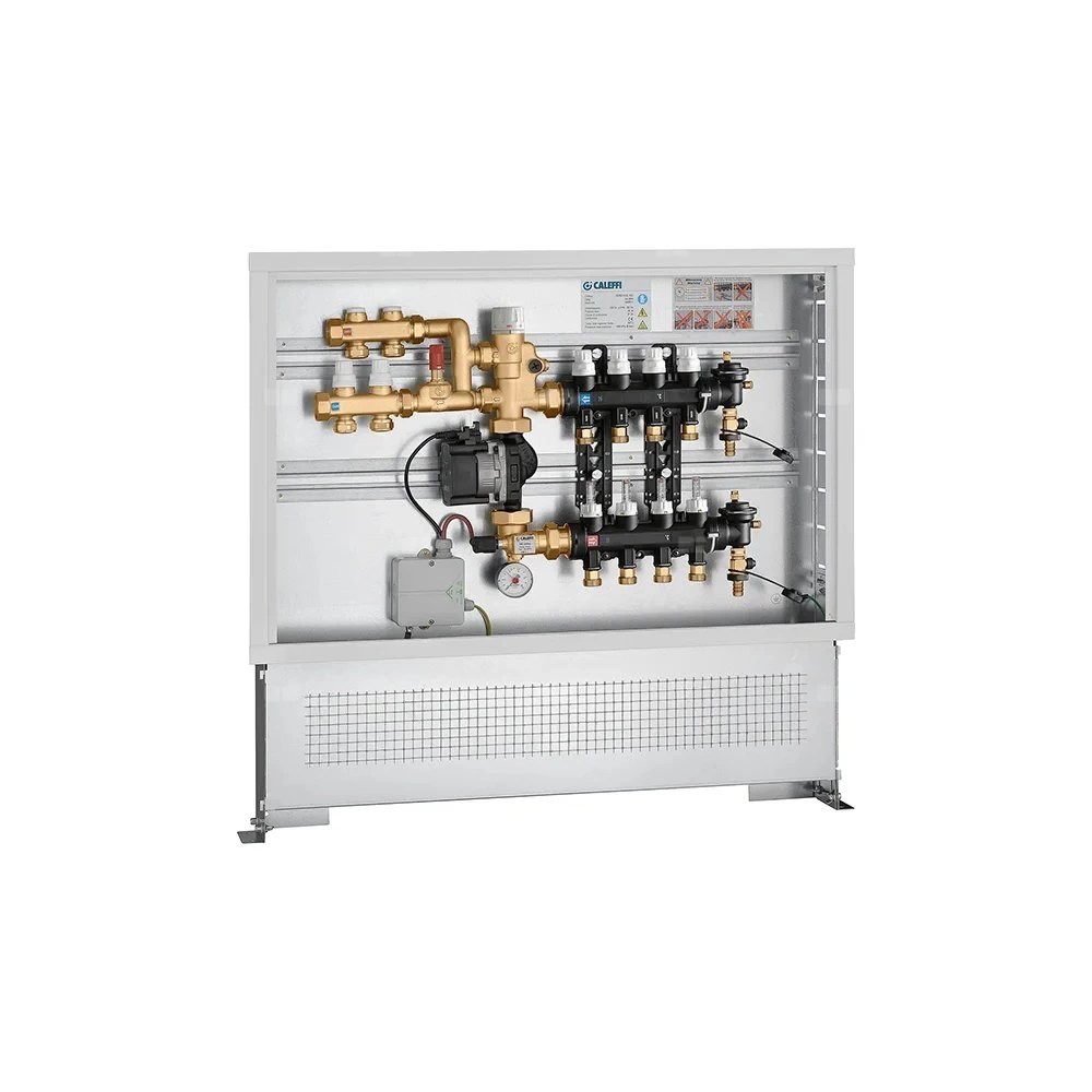 Zespół regulacyjny – regulacja stałotemperaturowa. Wstępnie zmontowany w skrzynce inspekcyjnej. 3 wyjścia. Dodatkowy rozdzielacz obiegu pierwotnego z dwoma wyjściami.