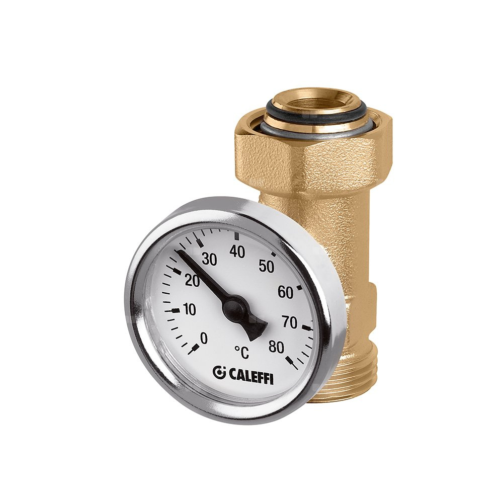 Złączka z termometrem do wyjść z rozdzielaczy Przyłącze: G 3/4" A (ISO 228-1) GZ, wlot, Podłączenie do złączek Caleffi. Przyłącze: G 3/4" (ISO 228-1) GW, wylot, nakrętka mocująca. Wymiary/ Średnice: Ø 40 mm. Skala termometru: 0–80 °C.